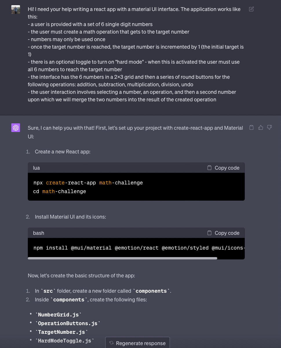 I woke up early on Sunday a few weeks ago. Restless. Normally, I'd watch some mindless videos on YouTube, reading part of a book, or put on some series while I have a coffee and hang out. Over the past few weeks I had started and stopped a few programming ideas and in doing so tested out the flow of prototyping with ChatGPT as a coding co-pilot. In each previous attempt (literally 3 different ideas), ChatGPT had fallen short - probably because I was asking it to do too much with my lazy requirement definitions. I'm prototyping here, not trying to debug some well developed code. This time, though, I had a clear idea of what the requirements were and so I prompted ChatGPT to throw together a React app that would test the idea.