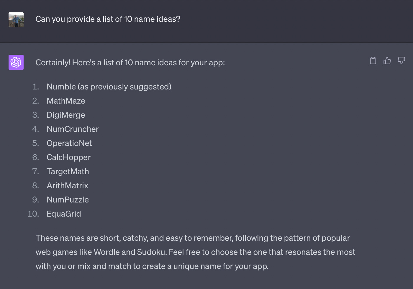 I went to ChatGPT, in the same chat that I explained all the rules and got the prototype code from… ”What's a good name for this app? Think along the lines of Wordle, sudoku, and other fun web games that people play” I wrote - admittedly not the best prompt for someone as well-versed in AI as me…